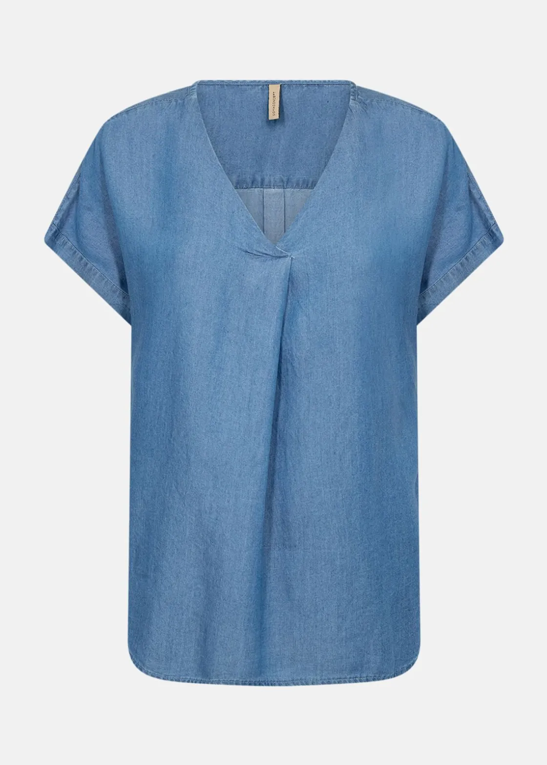 Denna T-shirt erbjuder en stilren och mångsidig look med sin V-ringade design och veck framtill som ger extra form. Tillverkad av 100% Lyocell, känns den mjuk mot huden och faller elegant ner till höften. Perfekt för både avslappnade och mer uppklädda tillfällen, kan den enkelt kombineras med både byxor och kjolar för en komplett garderob.