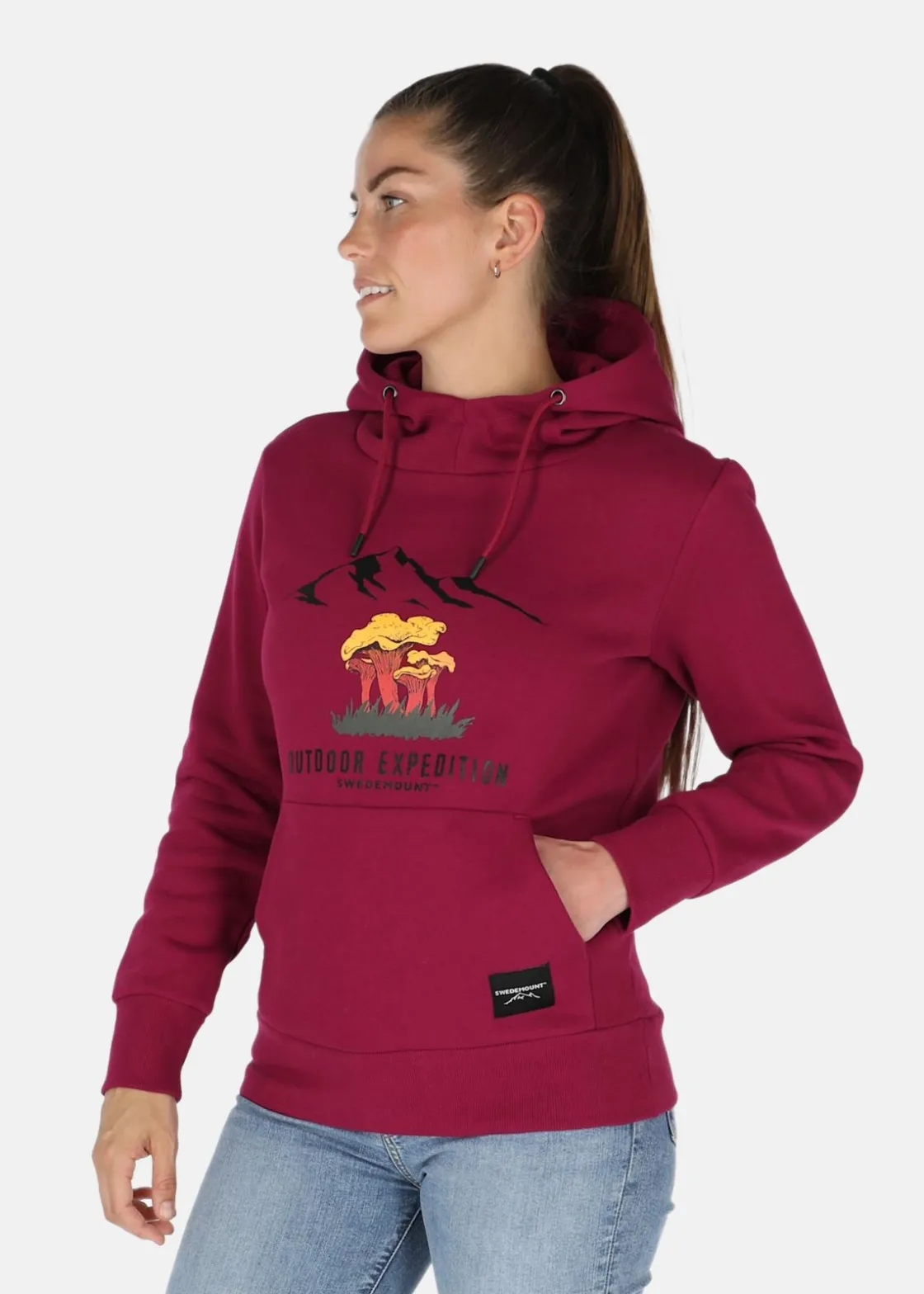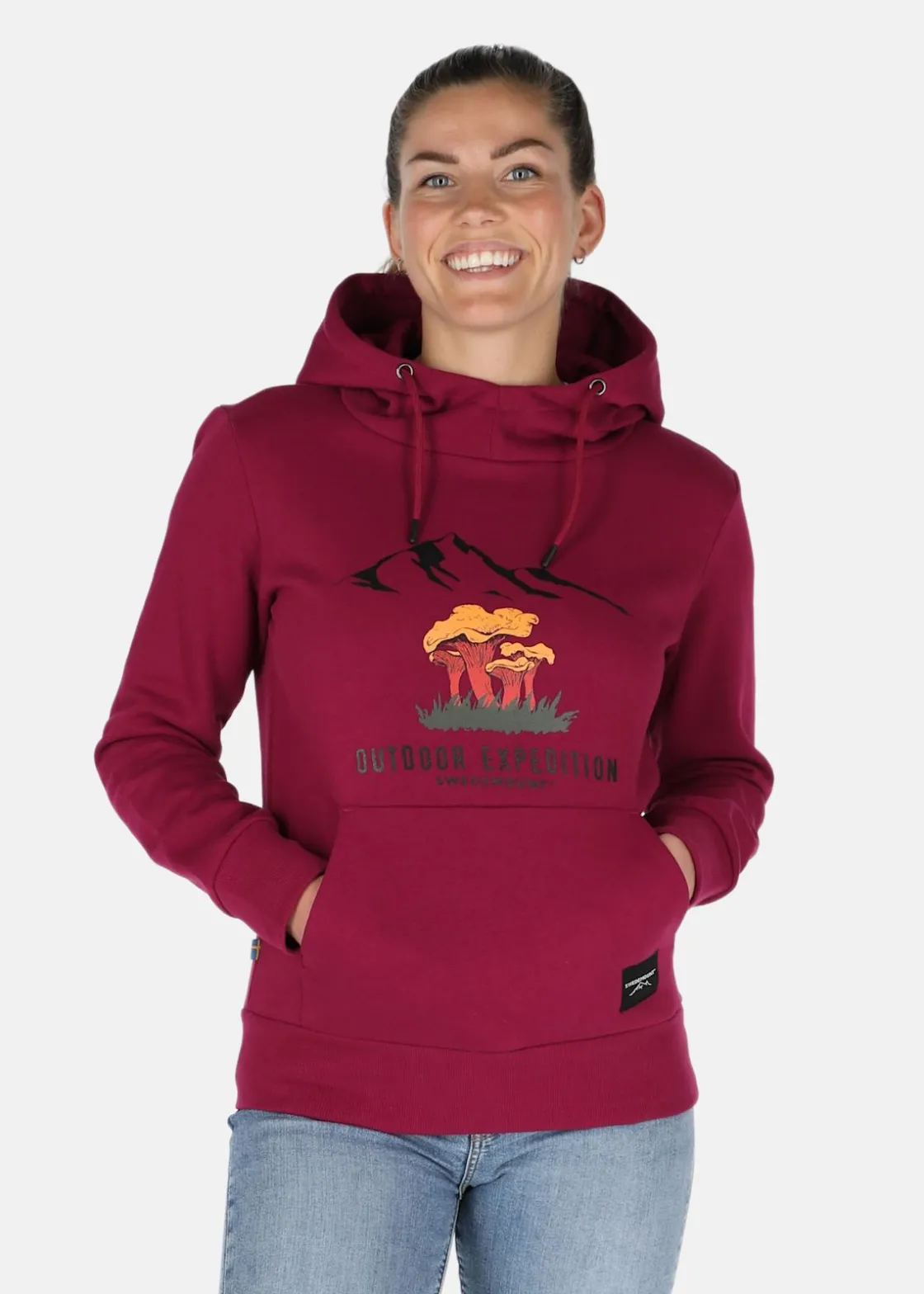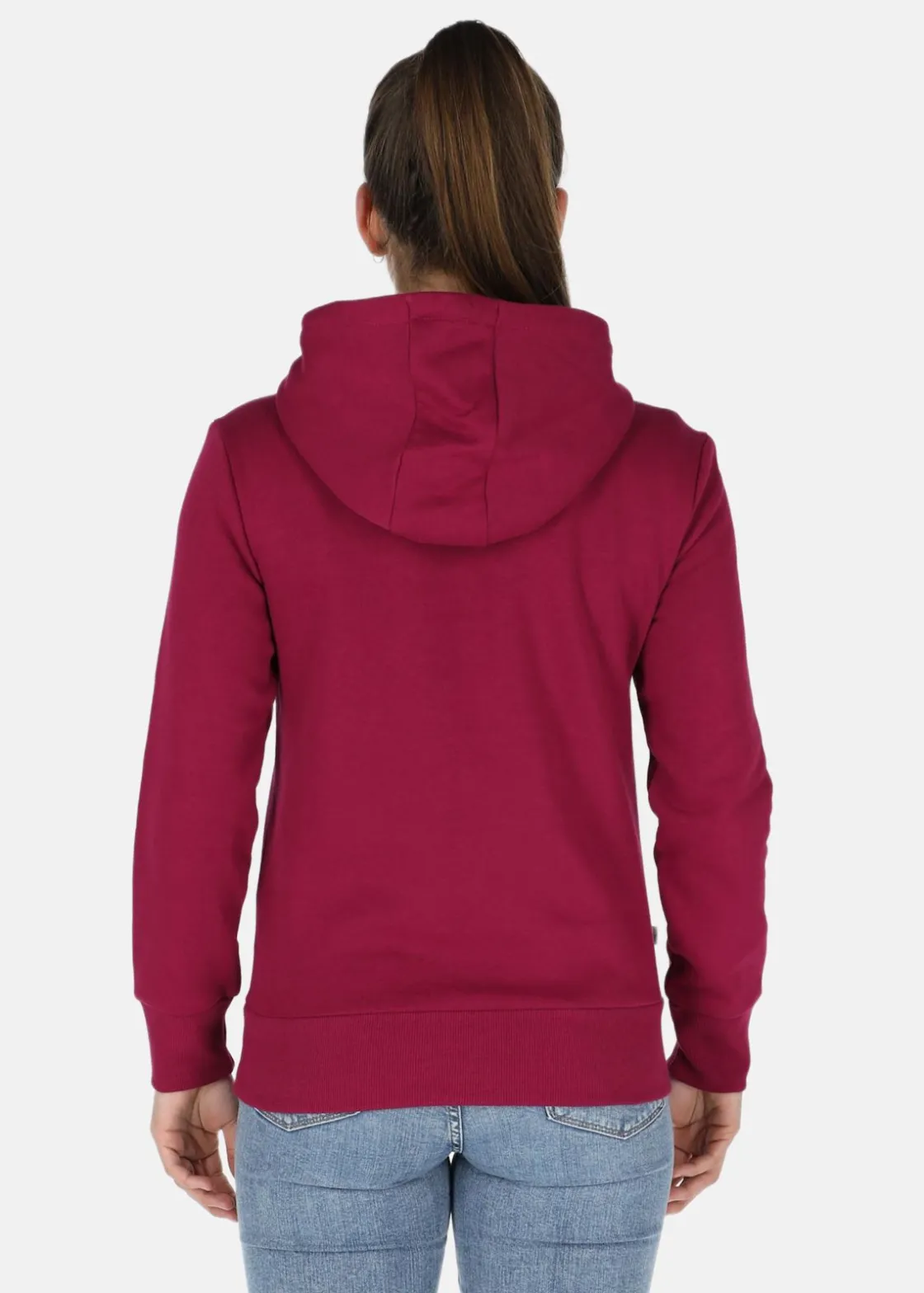 Mjuk tröja med justerbar huva och en stor ficka fram.