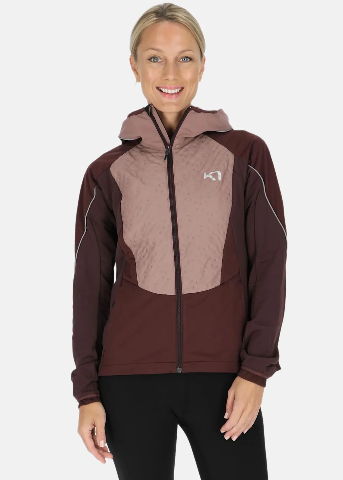 Träningsjacka med en huva och hög krage. Två fickor och reflekterande logotryck. Vattenavvisande material och skön passform för användning vid löpning, träning och vardagsliv.