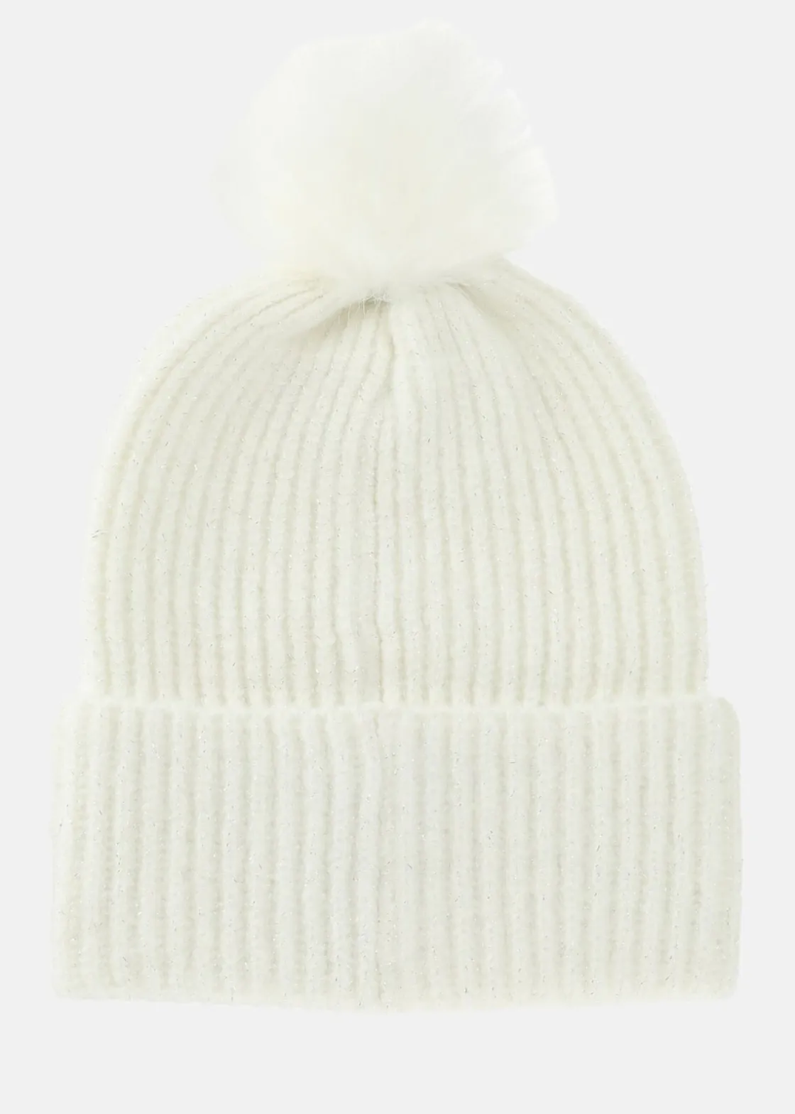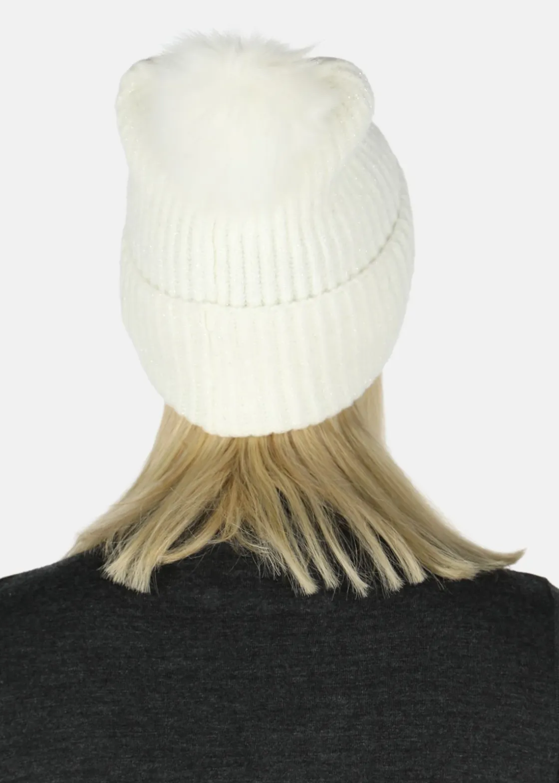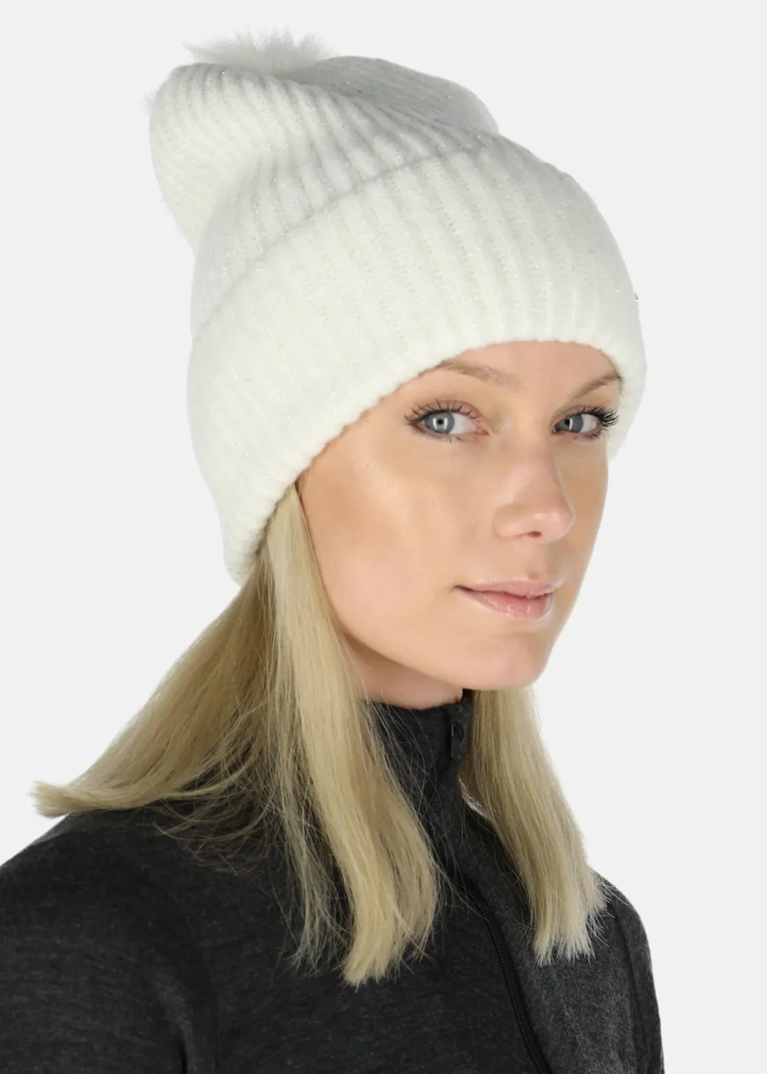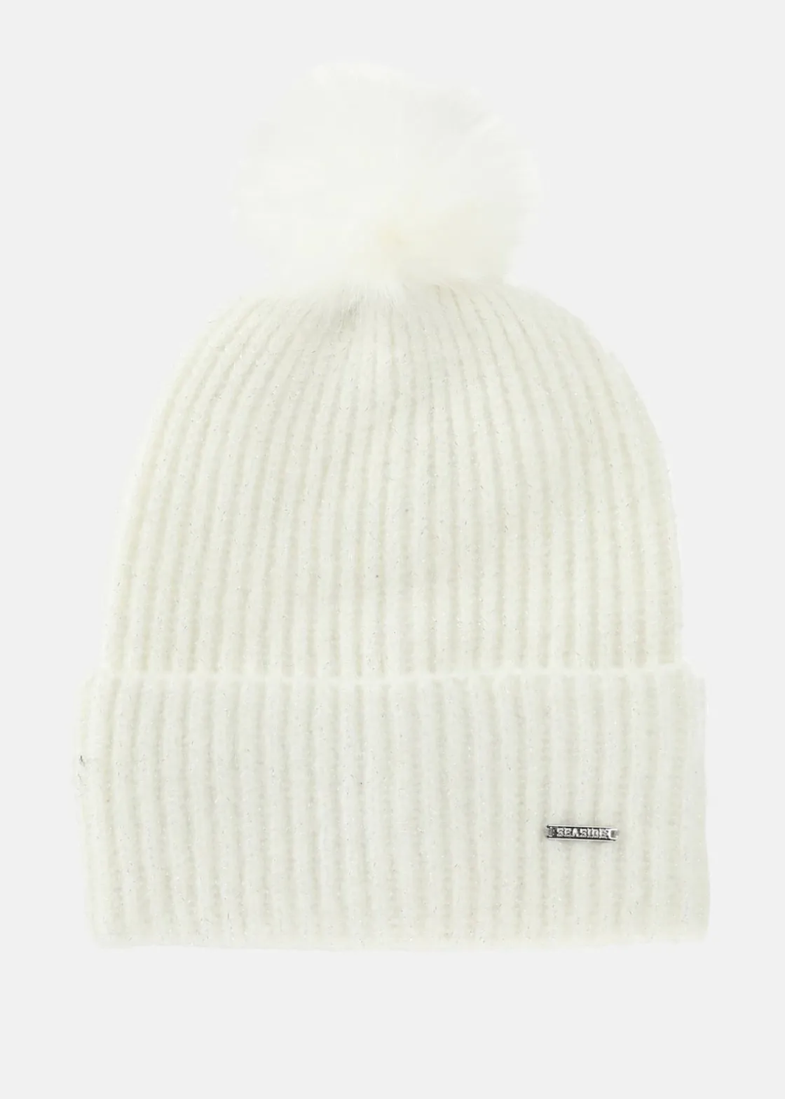 Värmande material med en stickad design och fuskpälsboll på toppen. Uppvikt nederkant och metallogga.
