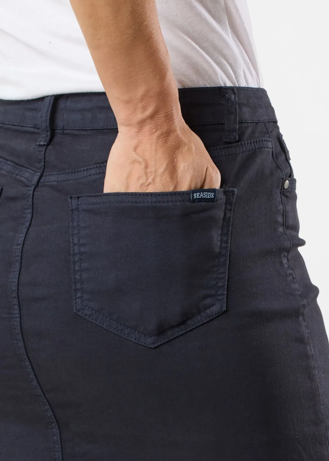 Stretchig kjol från Seaside med skön passform och stilren design. Klassisk gylf med dragkedja och knapp upptill, bälteshällor i midjan och fyra rymliga fickor. Sidoslitsar i nederkant för design och ökad rörelsefrihet. Perfekt för både uppklädda och avslappnade tillfällen.