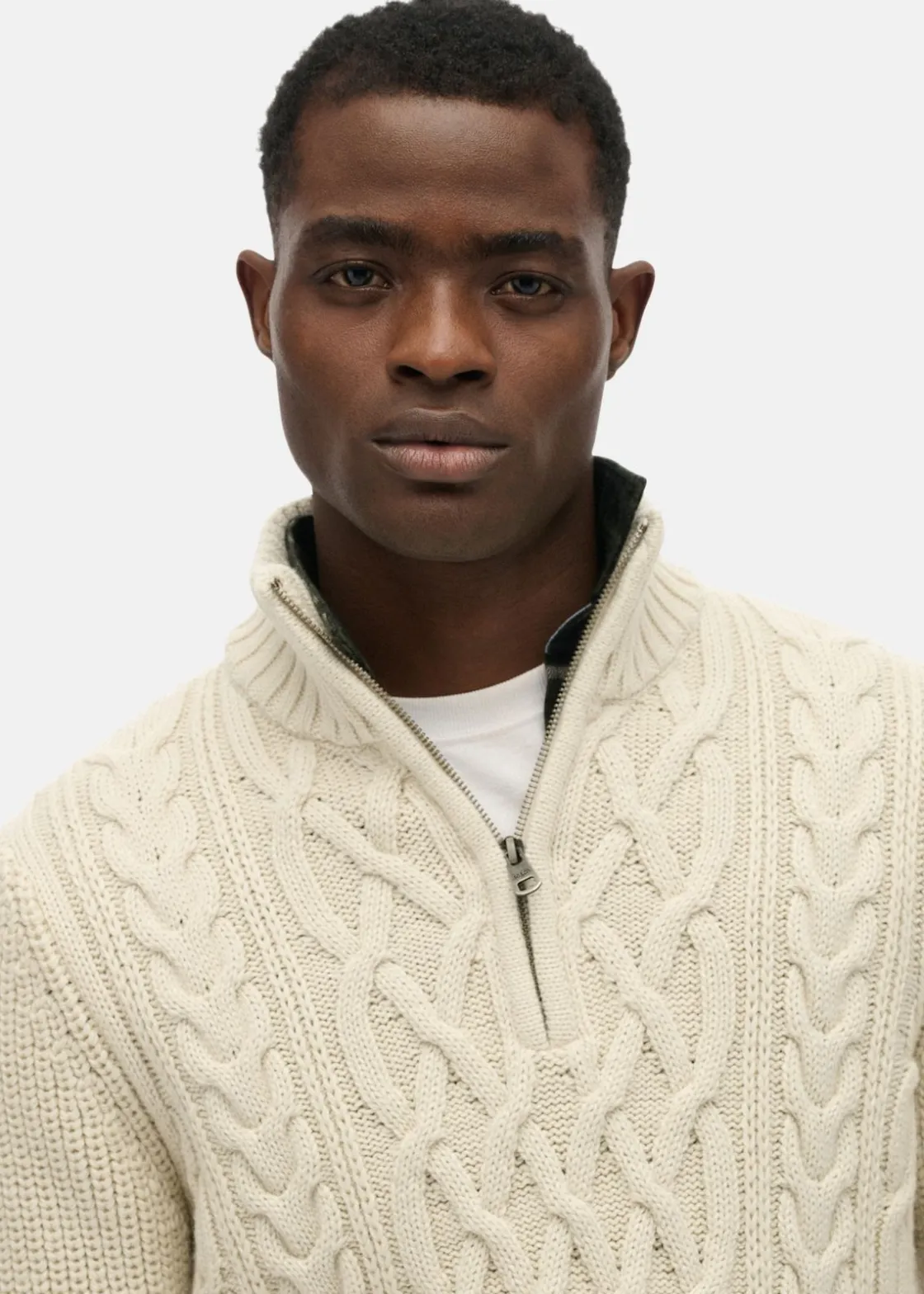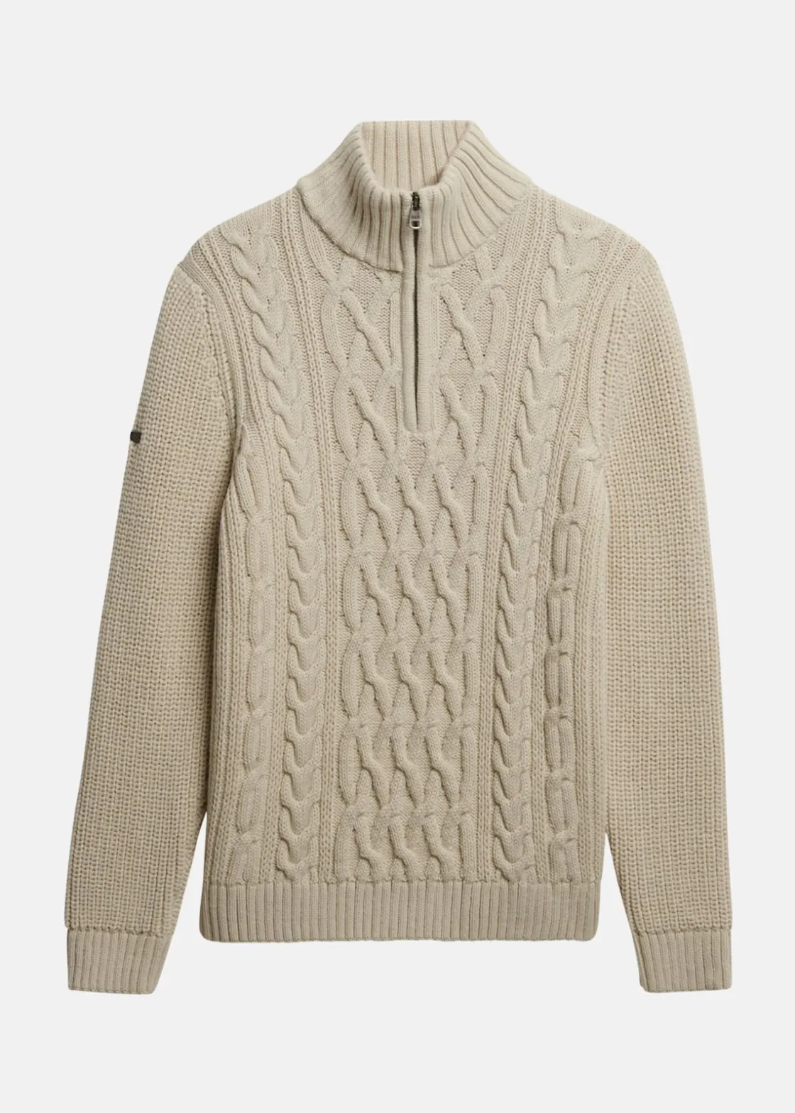 Tröjan har ett klassiskt kabelstickat mönster och halv dragkedja i kragen – perfekt att bära som lager eller för sig själv. Ribbstickade muddar och en metallbadge ger en genomarbetad känsla i ett plagg som funkar både till vardag och jobb.