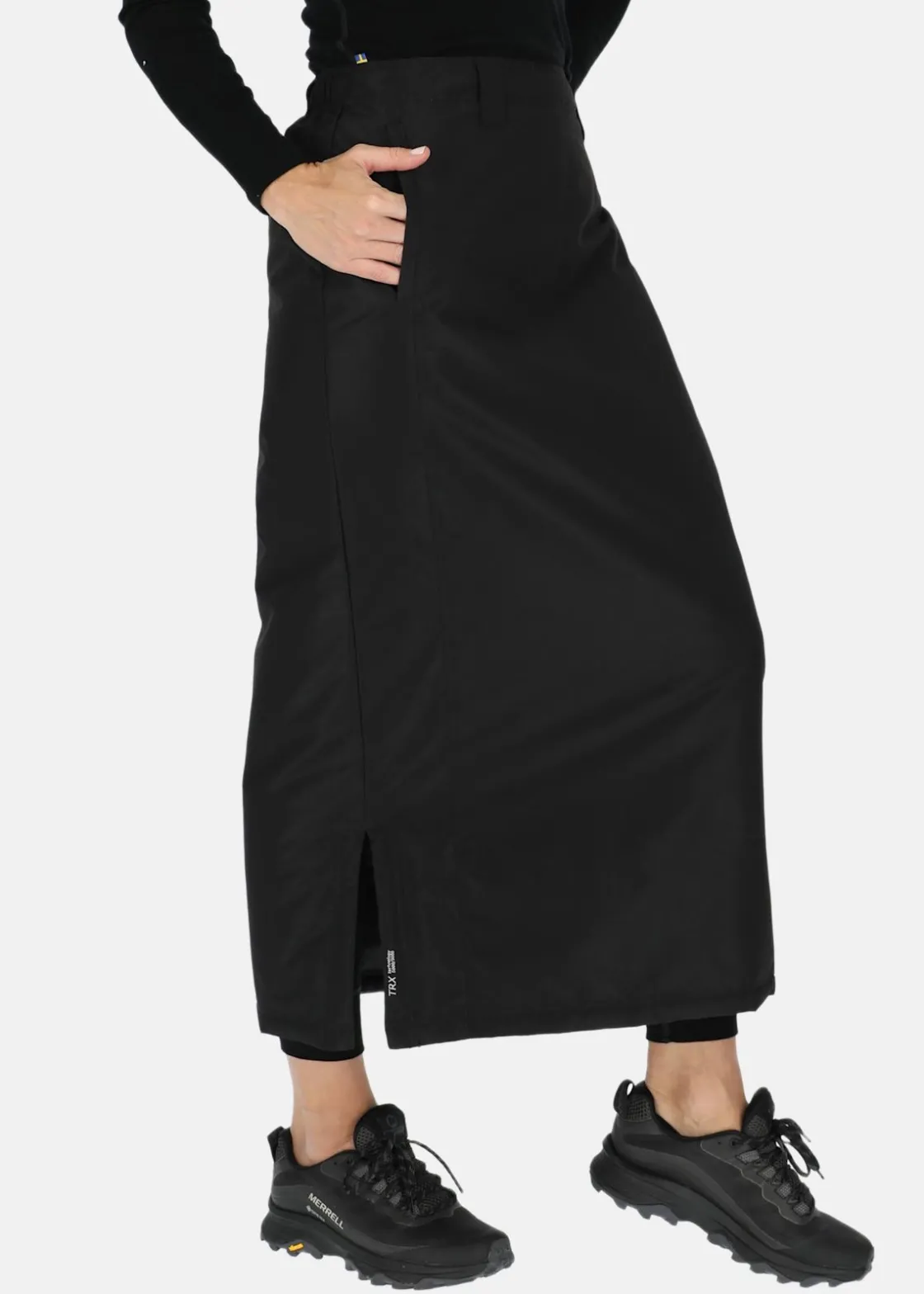 Sälen Skirt från Tuxer är en snygg och funktionell kjol för aktiva kvinnan. Tillverkad i vind- och vattenavvisande material håller den dig torr och bekväm oavsett väder. Kjolen har bälteshällor i midjan för en perfekt passform. Med den långa dragkedjan längs sidan gör det enkelt att ta av och på sig kjolen. En mångsidig kjol för promenader, vandring, utejobb eller andra aktiviteter utomhus!