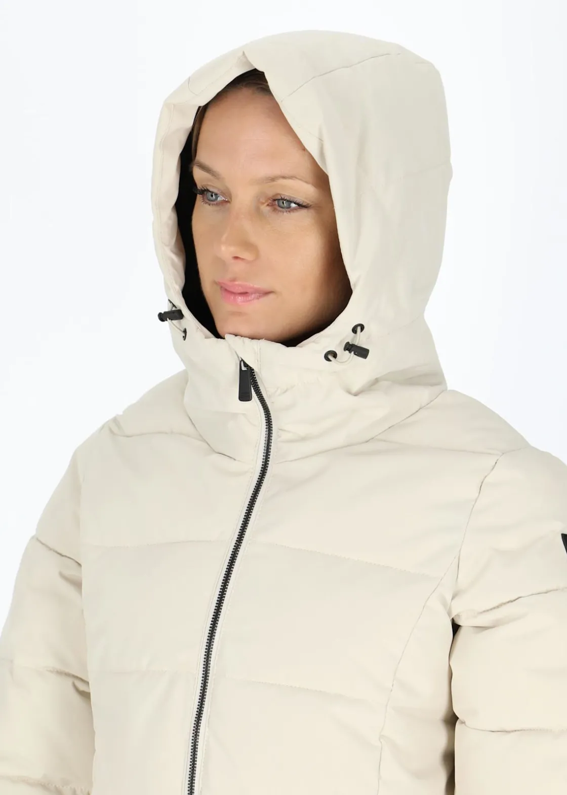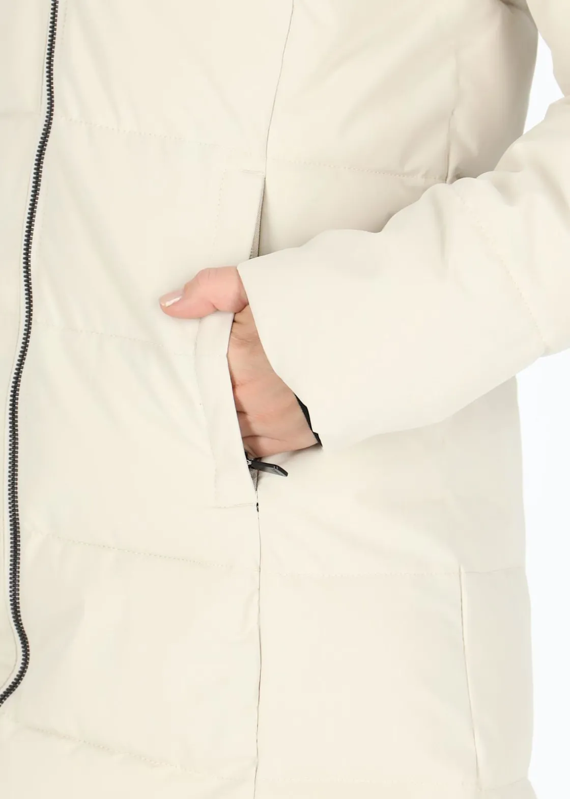 Justerbar huva och hög krage. Två sidofickor och en innerficka med dragkedja. En varm, lång jacka med ett vind- och vattentätt material och en normal passform perfekt för alla tillfällen.