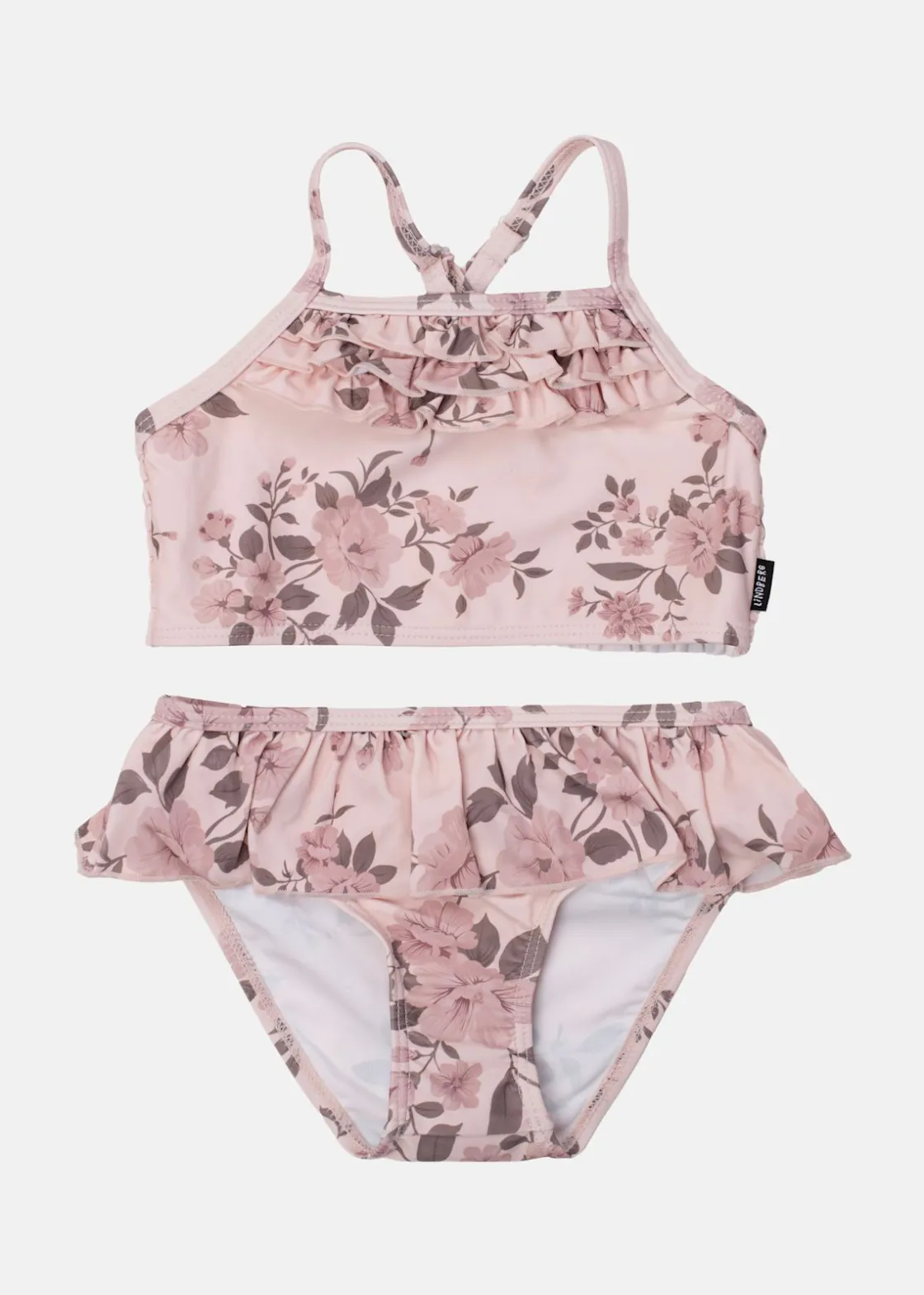 Bikinin har en stilfull design med volanger och extra foder framtill för ökad komfort. Axelbanden bildar ett elegant kryss i ryggen, medan smockdetaljerna bak ger en följsam passform. Materialet erbjuder solskyddsfaktor 50+ och är OEKO-TEX® Standard 100-certifierat för säkerhet och kvalitet.