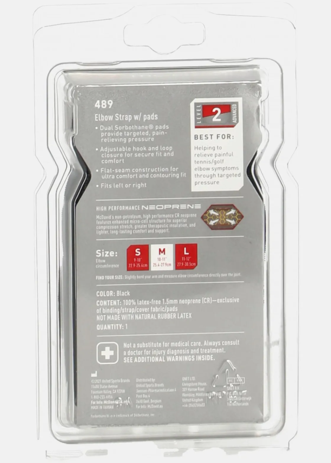 McDavid Elbow Strap med kuddar lindrar effektivt smärtsamma tennisarmbåge- och golfarmbågssymptom med riktat tryck. Dubbla Sorbothane®- kuddar och latexfri neopren säkerställer bekväm användning och optimal läkning genom termisk kompression. Den justerbara kardborreförslutningen och den lätta designen gör produkten enkel att anpassa för både vänster och höger arm, vilket ger en perfekt passform för längre användning.