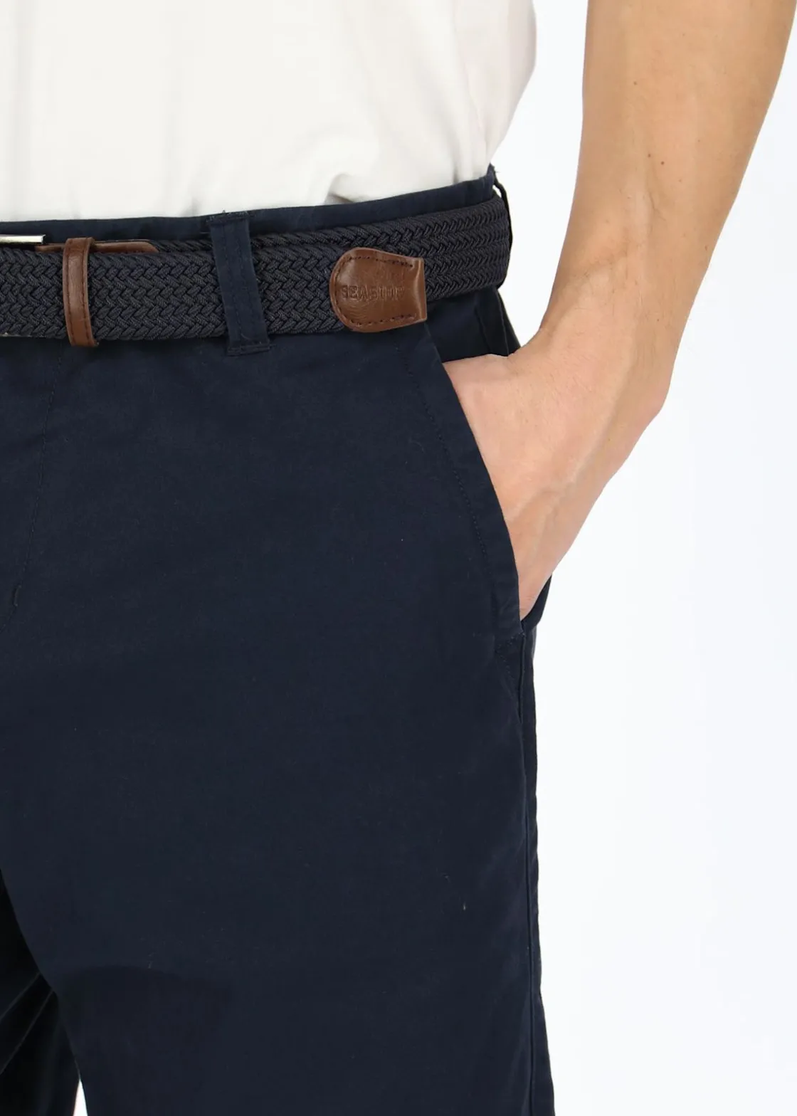Dessa shorts har en fin och stilren design som passar lika bra på stranden som på en sommarfest. Med blixtlås och knapp framtill sitter shortsen säkert och bekvämt på plats. De har två öppna sidofickor och två bakfickor förslutna med varsin knapp, vilket ger dig gott om plats att förvara viktiga saker. Shortsen har uppvikta ben och ett elastiskt skärp som passar perfekt till shortsen och ger en snygg look. Du kan matcha dessa Chinos Shorts med en t-shirt för en avslappnad look eller klä upp dem med en snygg skjorta. Oavsett hur du väljer att bära dem, kommer du att känna dig bekväm och stilren i dessa shorts från Seaside. Så se till att lägga till dem i din garderob och vara redo för sommarens äventyr!