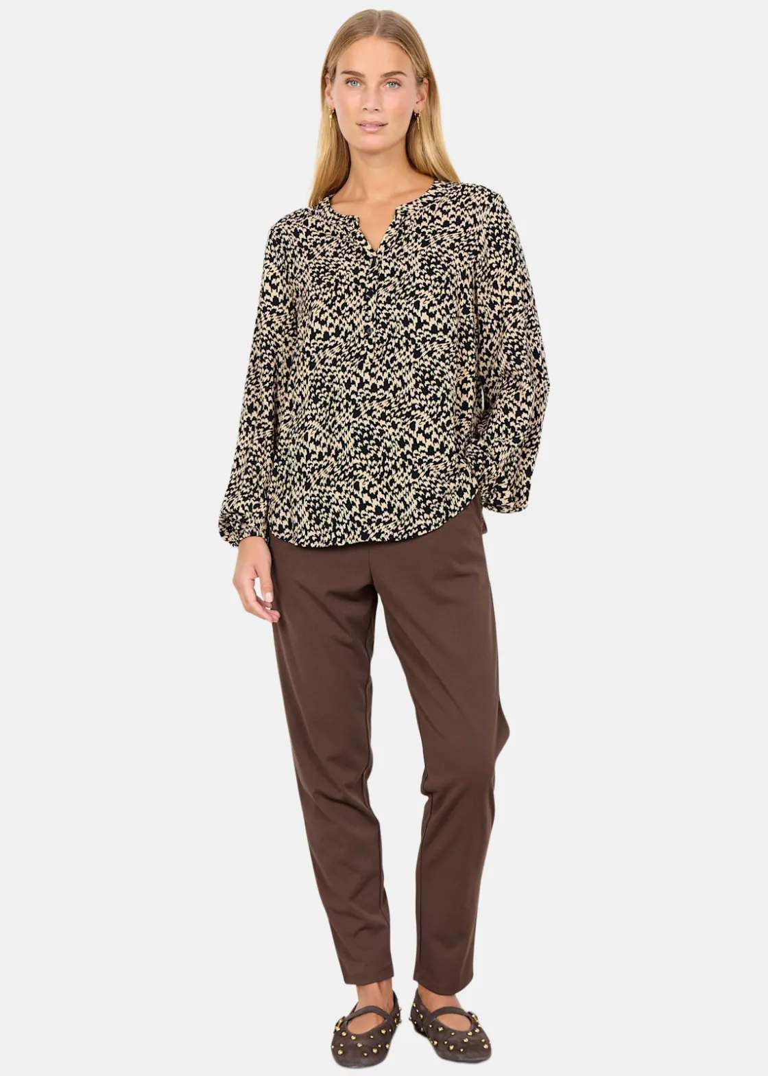 SC-VAN 1 Blus är tillverkad av hållbar viskos och erbjuder en stilren design med en V-ringad hals och knäppning framtill. De långa ärmarna med elastiska muddar ger en bekväm passform, medan det abstrakta trycket tillför en modern touch. Perfekt att kombinera med både skräddarsydda byxor och denim för en mångsidig stil.